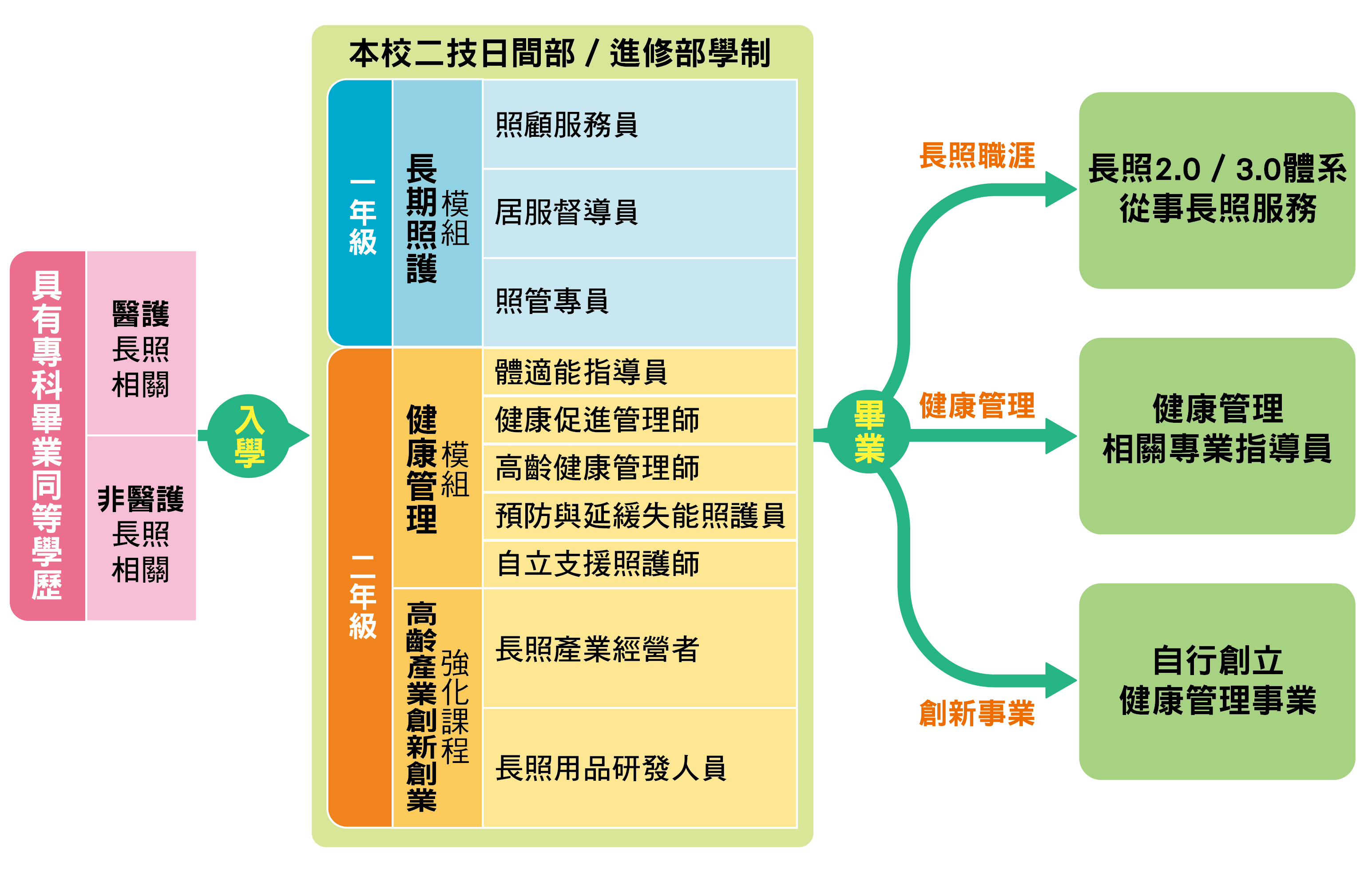 > 對焦夢想的修課計畫:從入學起即規劃學生可對焦未來長照職涯圓夢所需之基本知能與實務能力,具體做法如下: (A)入學前: 根據新生個人學習背景區分為長照與非長照兩組,分派本系專任教師進行關懷,了解學生就學背景與未來 就業期待,協助新生建立個人自傳與學習歷程檔案。(B)入學後:瞭解學生持有「照顧服務員丙級證照」情形,由輔導教師根據不同生源背景與經驗,制訂未來二年之個人 化修課計畫與職涯規劃。例如:於入學第一學期,即規劃未取得照服員證照的學生修習相關課程並開設證照輔導 班,協助取得證照,以順利銜接長照服務管理人才(居督與照專) 的進階課程,及第二年的健康管理模組與高齡產業 創新創業強化課程。